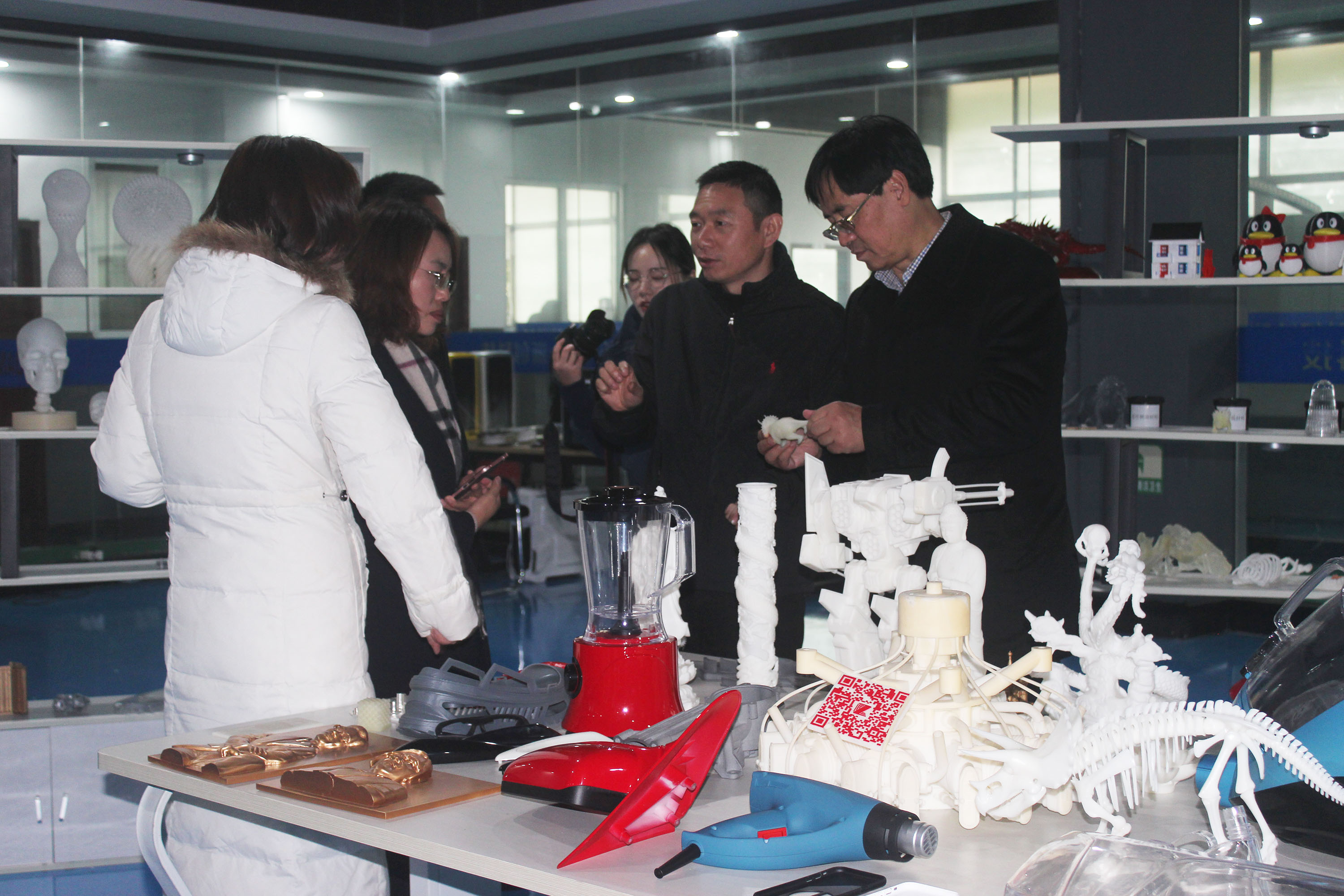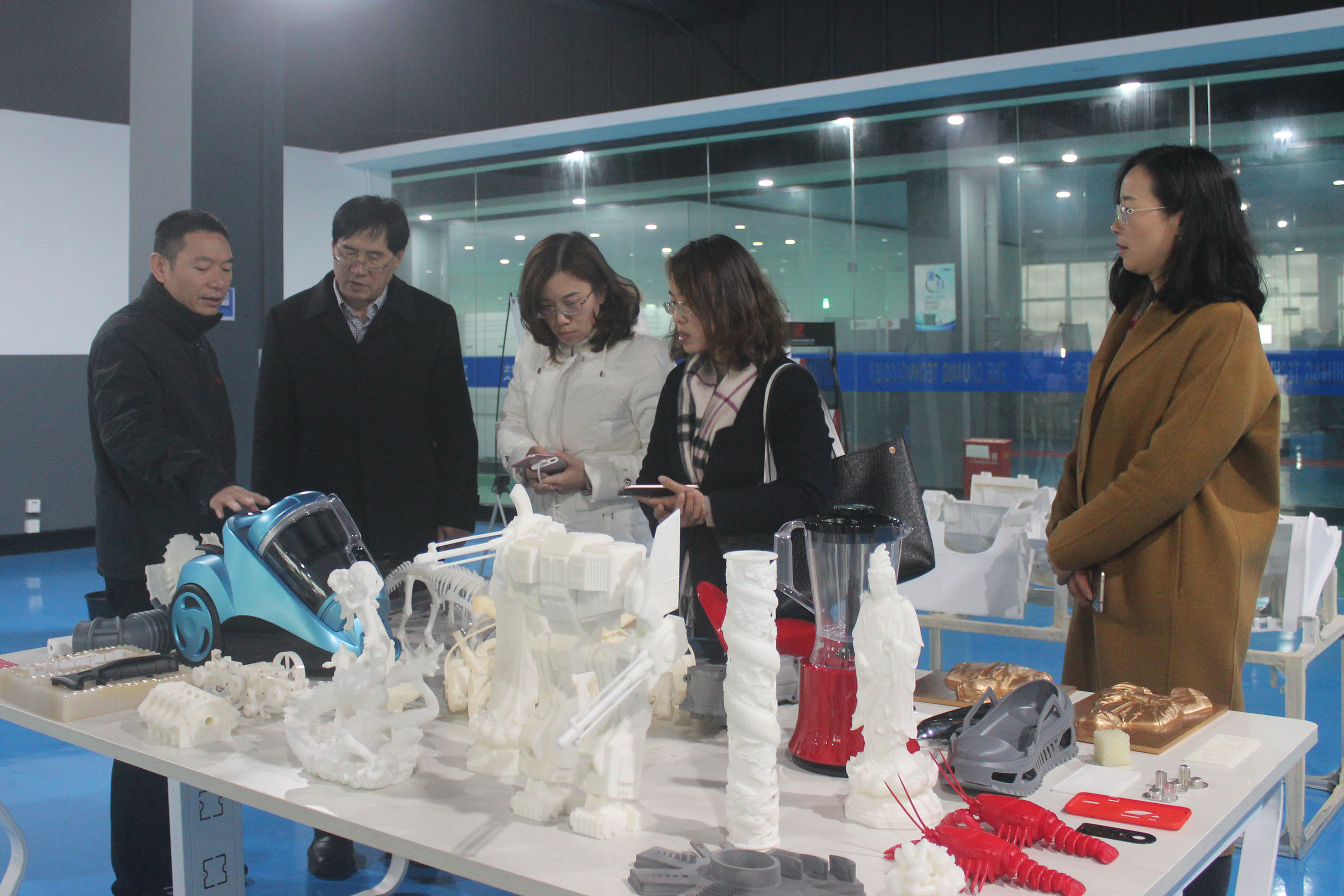 隨后,陶董事長帶領(lǐng)上海八號(hào)橋考察團(tuán)一行參觀了3D打印車間、3D打印樣品間,了解3D打印的成型原理,觀察3D打印機(jī)的打印過程。在3D打印樣品間,陶董事長向上海八號(hào)橋考察團(tuán)一行介紹了3D打印應(yīng)用的優(yōu)勢。隨著3D打印的普及應(yīng)用,昂貴的開模費(fèi)將成為過去式。以往制造業(yè)幾百萬的模具費(fèi),借助3D印能輕松省掉一半多。手板成本的降低,會(huì)進(jìn)一步推動(dòng)企業(yè)創(chuàng)新設(shè)計(jì)。